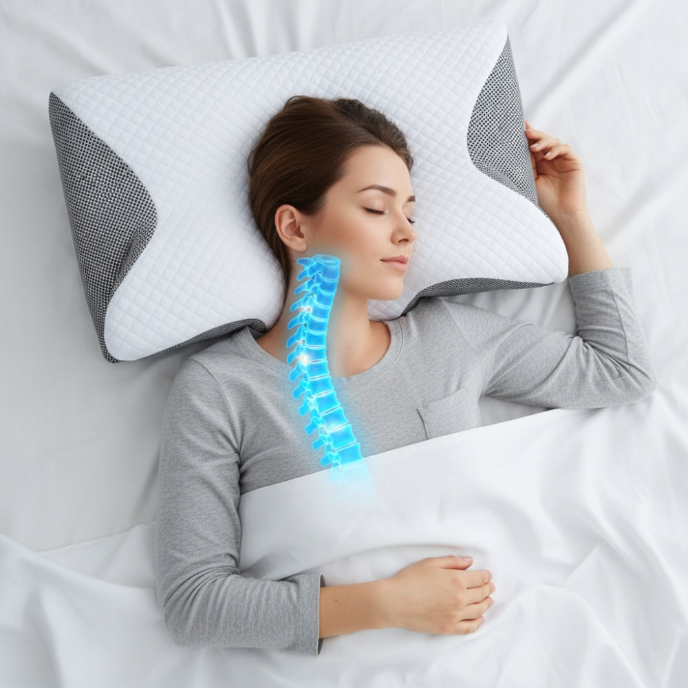 An ergonomic pillow engineered to correct your sleeping posture, alleviate neck & shoulder pain, & improve sleep quality.
